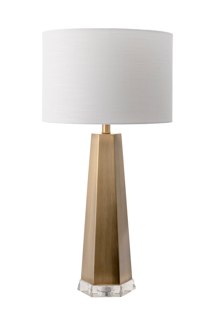 Calm the vibe in your space with this modern and sharp table lamp. The brass-tone ombre offers a soothing look that fits well in modern or contemporary inspired interior design. The drum shade works with the scale of the lamp, bringing balance to the design. Linen fabric on the shade diffuses light well, giving you functional, warm illumination. Designed with you in mind, Rugs USA provides an LED bulb, allowing your lighting to take center stage effortlessly.<br><br><b>Dimensions</b><ul>