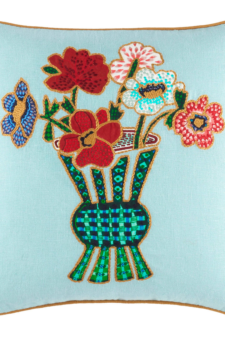 Inspired by an original still-life painting our designers discovered and loved, this whimsical rendering is appliqued and embroidered by hand. Exquisite needlework, contrast piping, and satin threading make for a singular aesthetic and a subtle, beautiful luster. Mix and match this lumbar pillow with coordinating options to create an eye-catching pillowscape on a bed or sofa. Pillow reverses to a solid color.