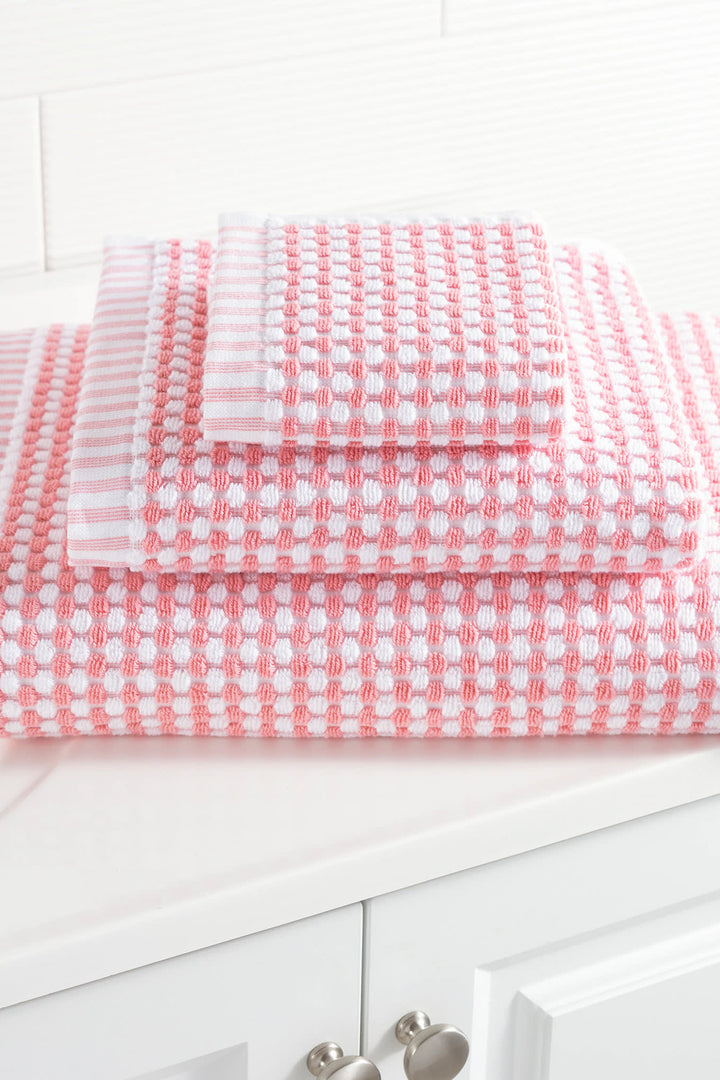Plush and absorbent, these charming all-cotton towels are made of uncut loops dotted on a white base with end-on-end striped hems. Made in Turkey and constructed of premium Turkish cotton that has extra long fibers and becomes even softer and fluffier with successive washings.