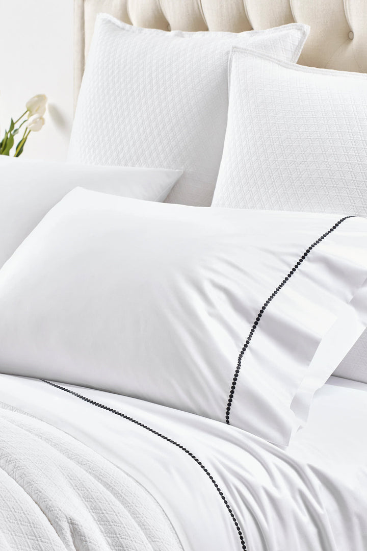A line of embroidered dots accents these crisp white cotton percale sheets and pillowcases. Designed to add a little something extra to the turn-back reveal of your bed for a European Luxury Hotel vibe.