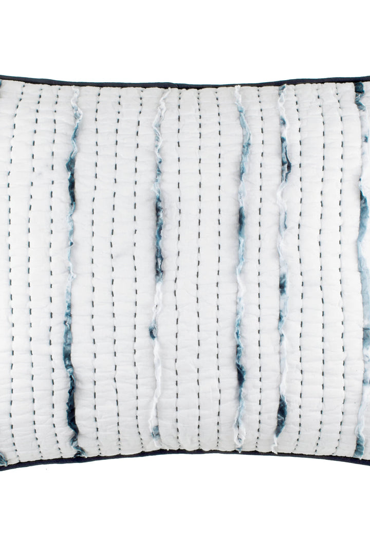With this cotton voile quilted sham, you get texture, contrast, and unique detailing, all in one! Indigo stripes, kantha stitching, and banding pop against this sham's bright white base, while soft voile and cotton batting provide a cozy surface.<br><br> • 100% cotton voile; 100% cotton batting.<br> • Kantha stitched.<br> • Solid indigo band/hem on all sides.<br> • Envelope back with ties.