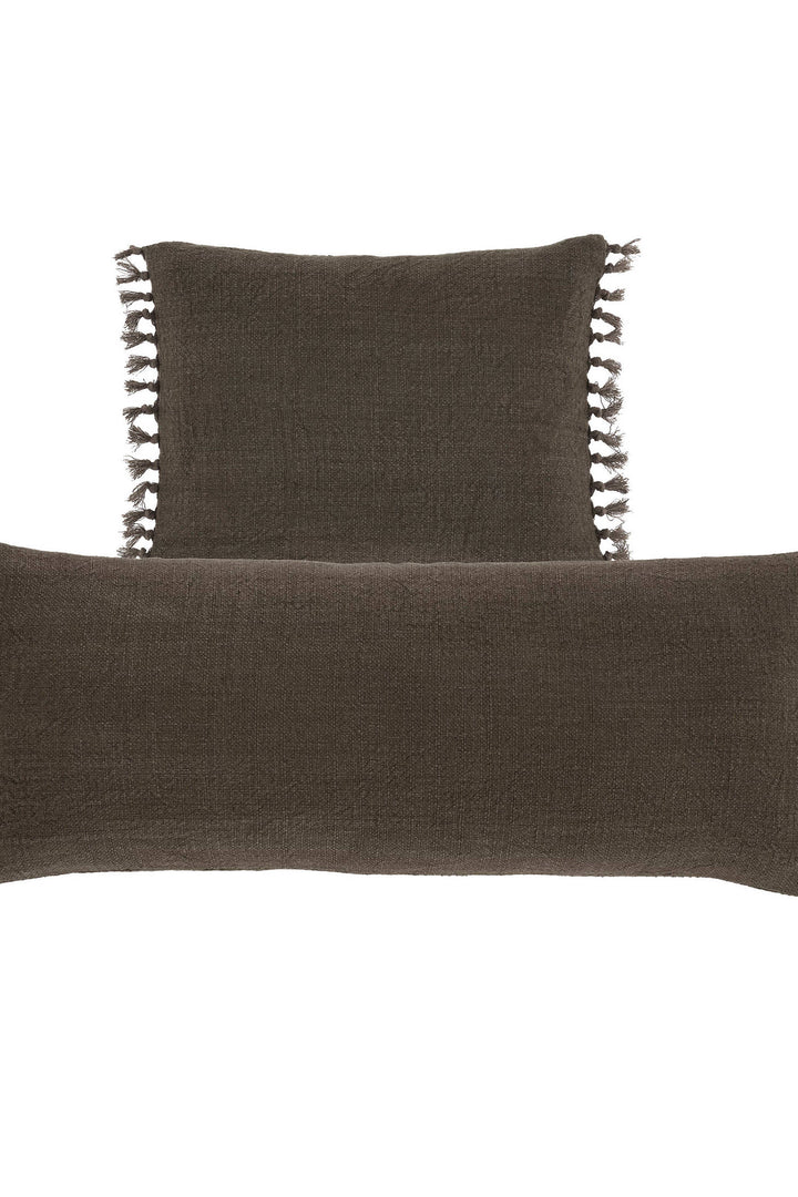 Dimension, drape, and earthen charm combine in this rustic, thick, densely woven fringed linen pillow. With rich fluidity and texture, dyed in a warm palette of saturated neutrals, it will bring a grounding character to a bed or sofa. Designed for us by Marie Flanigan, an award-winning interior designer and principal of Marie Flanigan Interiors, to reflect her signature style of timeless elegance and innovative simplicity.