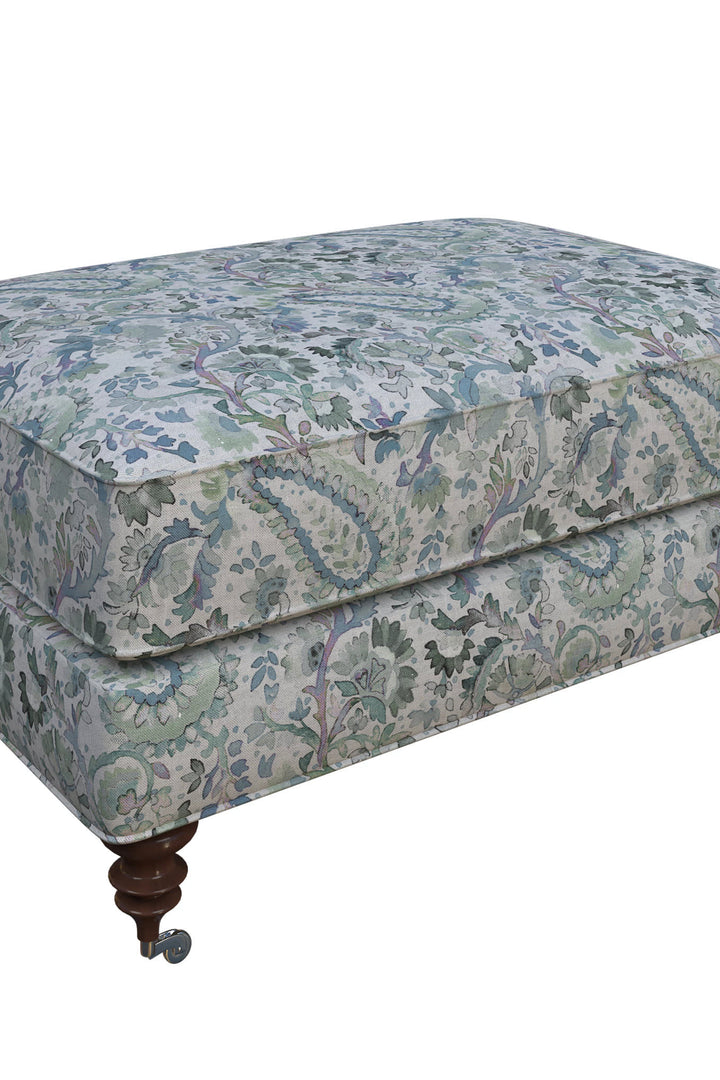 Equally at home in a wood-paneled library or a modern urban living room, our Norfolk ottoman features a wide rectangular shape, plentifully padded top and stylish turned legs. Use it as pull-up seating or add a tray and call it a coffee table. Designed to complement our Norfolk chair for a cultured, sophisticated feel. Custom upholstered in your choice of designer fabrics. Exclusively available from Annie Selke.