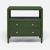 The simple silhouette and compact footprint belies ample convenient and discreet storage in this chic bedside nightstand. Two drawers rest in a hardwood frame with a warm white resin finish which is handcrafted in a multistep process. A faux fabric effect of Belgian linen gives texture and sheen to this charming piece that mixes well with upholstered furniture, making it a very appropriate addition for a farmhouse charm or coastal chic theme.