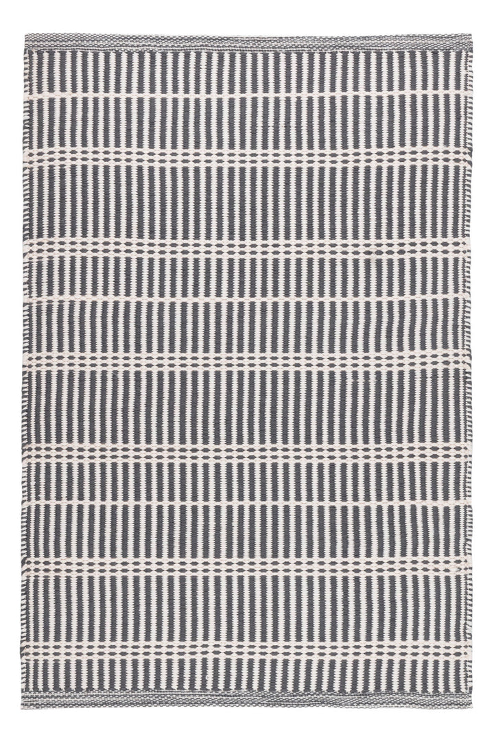 This bold, low profile, and tightly-woven rug is a stylish and sophisticated take on subtle patterning. Delicate, end-on-end mini stripes are intersected by intermittent bars of ivory overlay. Made of durable polypropylene and terrific for high-traffic areas, this washable, scrubbable, and bleachable indoor/outdoor rug will stand up to all that you dish out for years to come.