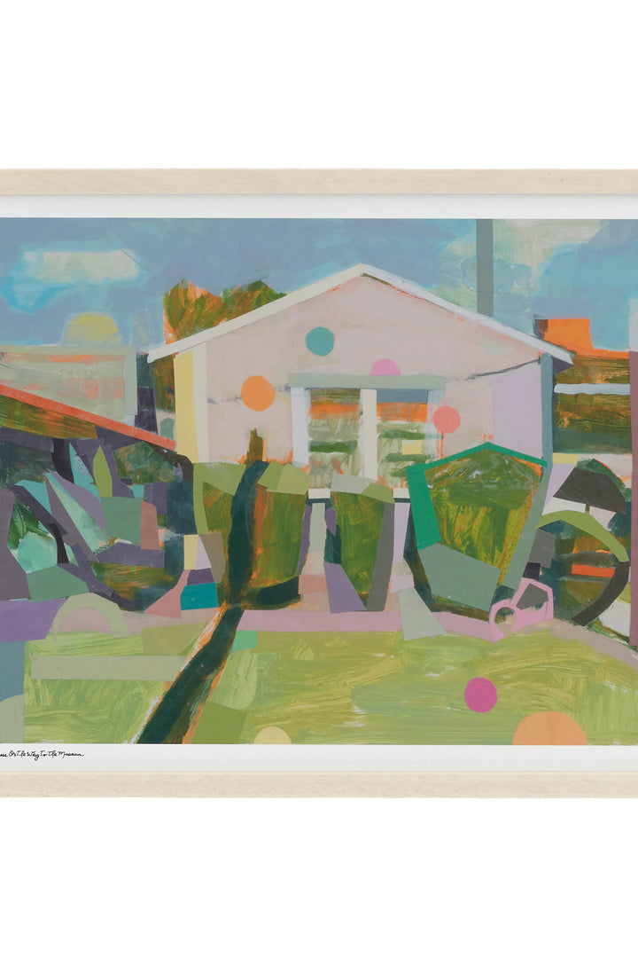 Artist Cynthia Wick uses an inventive mix of acrylics, oils, and paper to create a multifaceted impression of a quaint Los Angeles neighborhood filled with planes of color and light. Working loosely and intuitively, with surprising combinations of color and shape, the artist builds a bold, lyrical mosaic that mirrors an everyday scene once witnessed. Printed on textured paper and displayed in a wood frame, this piece arrives ready to hang.