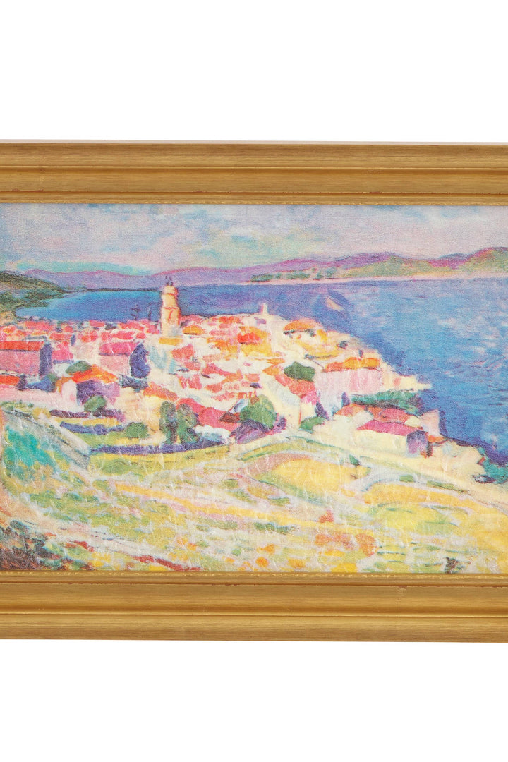 A walled seaside town in the south of France, surrounded by green fields and with distant hills across the bay, is portrayed in an impressionistic style in beautiful sunbleached colors of the Provence landscape.