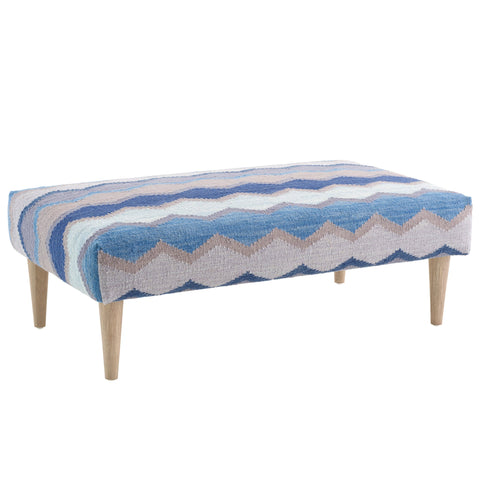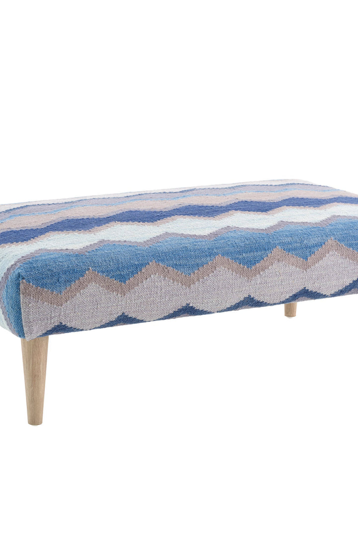 This beautiful addition to entryway, living room or bedroom is a versatile investment piece, used as occasional seating or a staging area for a tray. A cushioned bench is upholstered in this gorgeous kilim flatwoven wool rug, inspired by fishing nets flung over the sides of fishing boats. Foundational geometric rik-rak lines encapsulate atmospheric tonal hues evoking the ever changing reflection of light on the ocean. Supported by shapely turned-wood legs in a walnut finish. Available in two sizes.