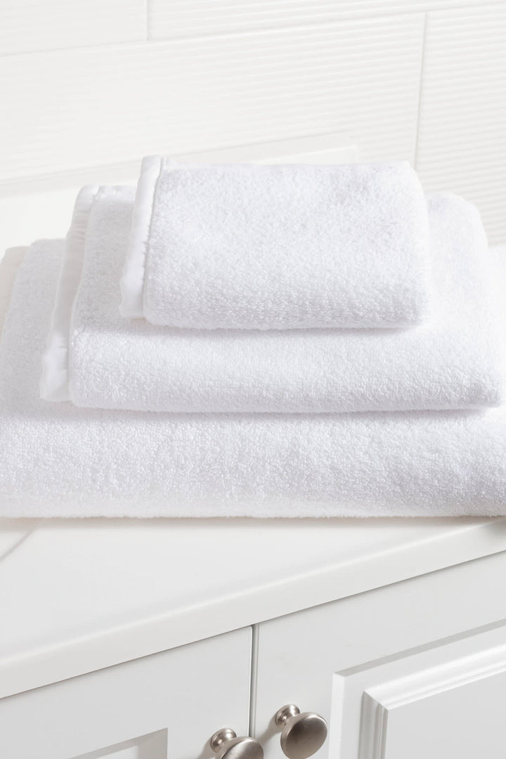 A superabsorbent, luxurious cotton bath towel is punched up with a single band. Made to coordinate with a variety of colors from light neutrals to dark moody greys and every hue in between.