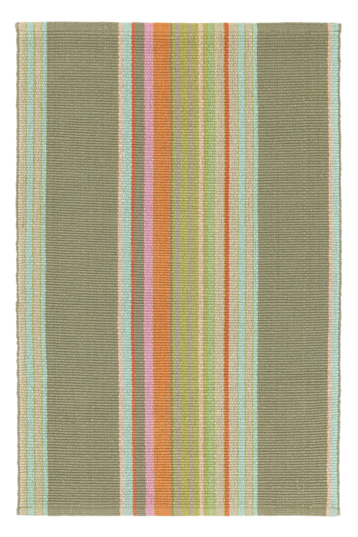 Bright stripes of red, orange, pink, citrus, and sky pop against sage green on this woven cotton area rug. These rugs are so adaptable they make themselves at home in any room. Constructed using a hand loomed flat weave in durable 100% cotton, these rugs are lightweight, reversible and affordable.
