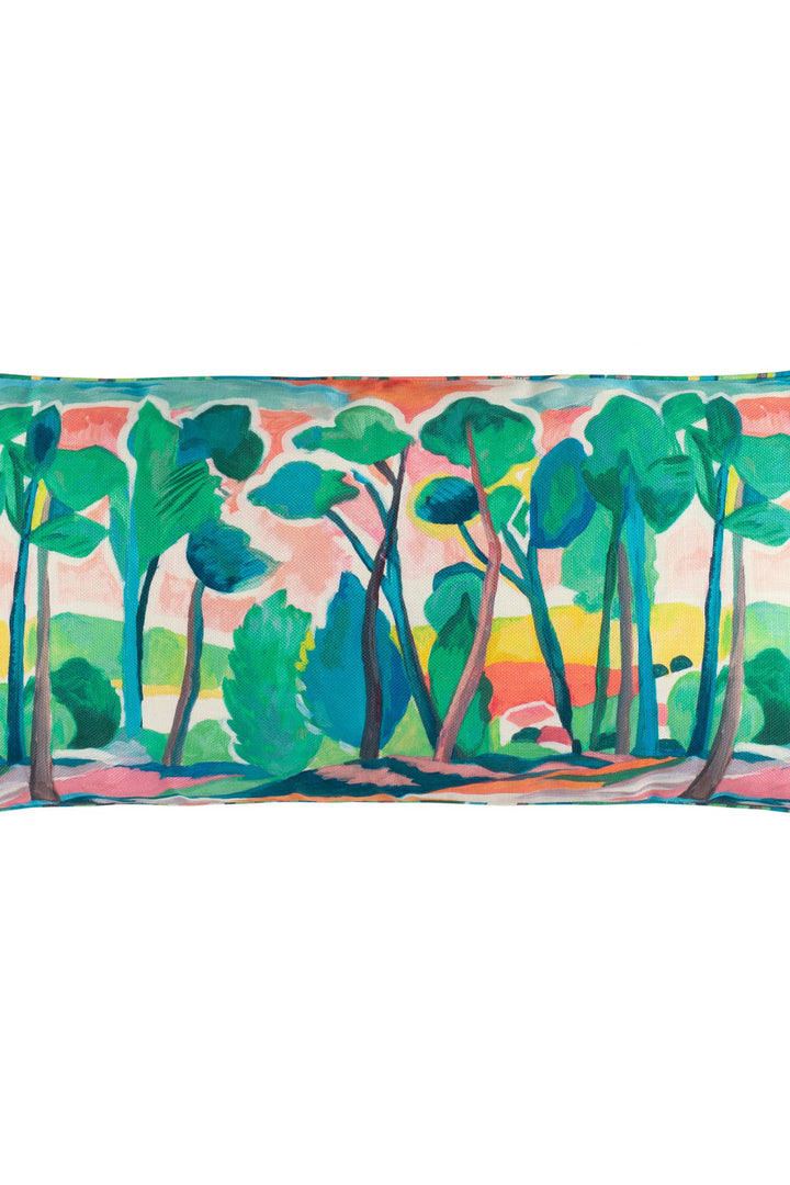 Drawing inspiration from an original watercolor painting, this printed lumbar pillow is filled with the warm colors of a lovely sunset shining through a treescape. Resistant to elements including sun and moisture, it’s designed for outdoors but also makes a colorful addition to an indoor pillowscape.