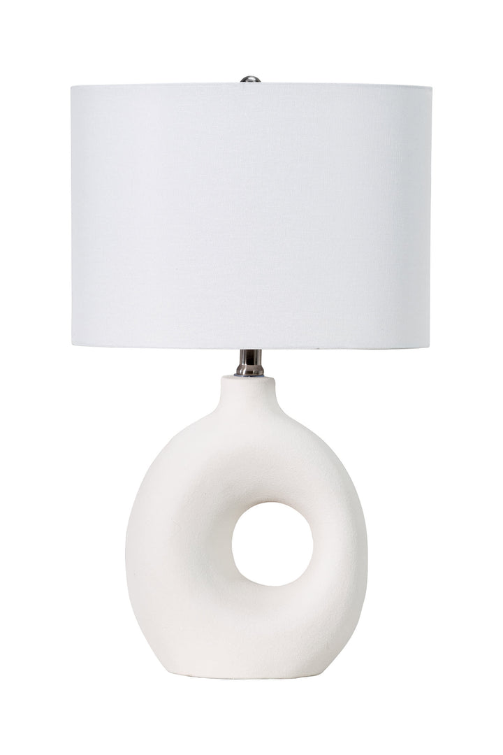 Crafted of white ceramic with an abstract sculptural design, this table lamp base features a curved open formation passing through its organically-shaped silhouette. With its smooth finish and inspired use of negative space, this exclusive lamp adds elegant visual intrigue to any tabletop. Designed with you in mind, Rugs USA provides an LED bulb, allowing your lighting to take center stage effortlessly.<br><br><b>Dimensions</b><ul>