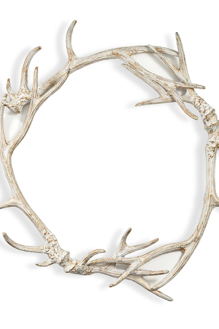 Add a touch of woodland whimsy to your holiday with this distinctive wreath, made from white-washed, cast aluminum antlers. Use a hook or looped ribbon to hang it from your mantel or combine it with holiday greenery for a rustic look.