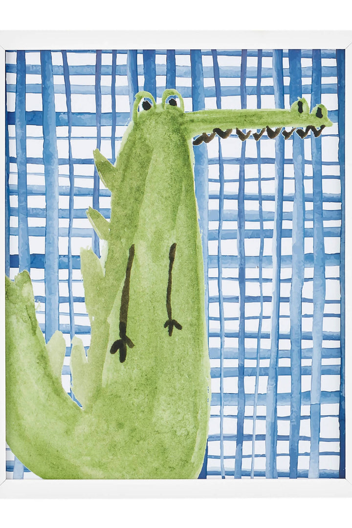 Albert Alligator is the sweetheart of our swamp! Set against a hand painted backdrop of French Blue seersucker checks, this paddling pal sets a cool profile.This whimsical watercolor portrait is part of an eclectic collection of artwork curated to inspire curiosity and make everyday a little bit brighter. Coordinating in color and style to help you seamlessly create gallery walls in a nursery or playroom. Each piece is designed, printed, framed and shipped with care from a family owned business in North Carolina and arrives ready to hang.