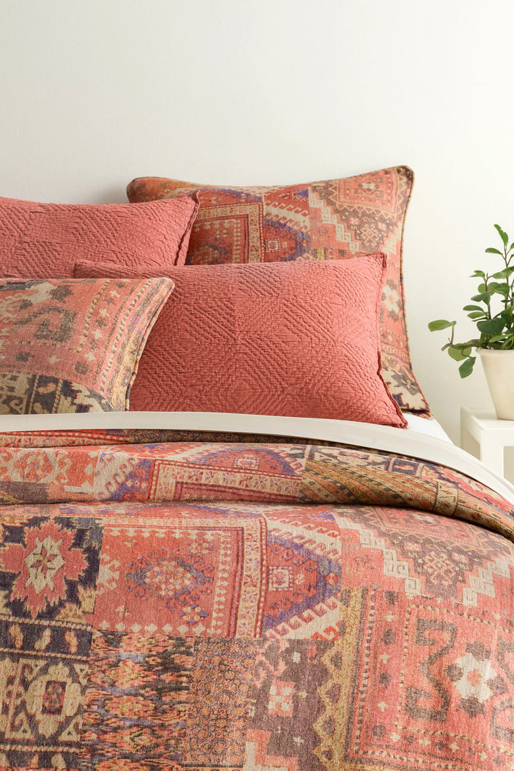 Go East with this colorful linen duvet cover, digitally printed with a patchwork of kilim-inspired patterns in shades of blue, terra-cotta, java, and brick. Coordinates beautifully with both neutrals and patterns, including our Laundered Cotton throws, Linen Mesh coordinates, and Anatolia decorative pillows and throw.