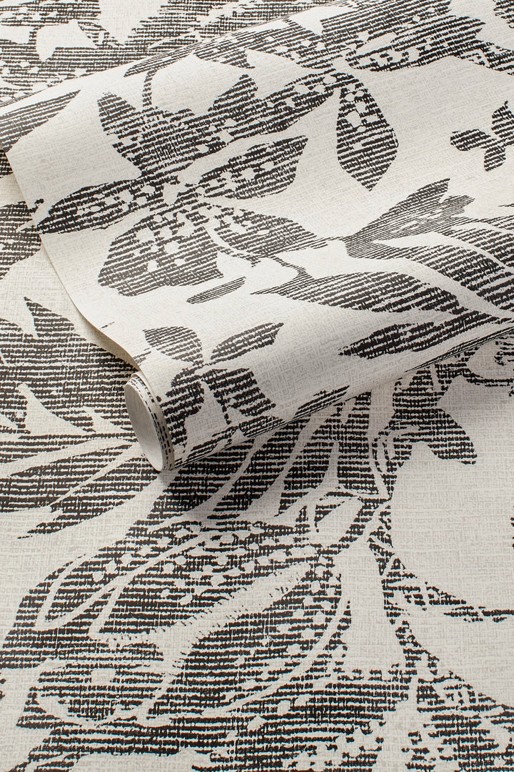 Inspired by Colonial woodcuts, this bold, large-scale botanical wallpaper is intricate and beautifully simple at the same time. Made from high-quality eco-friendly unpasted ivory paper inked with fine, detailed images of lush black fronds, buds, and pods.