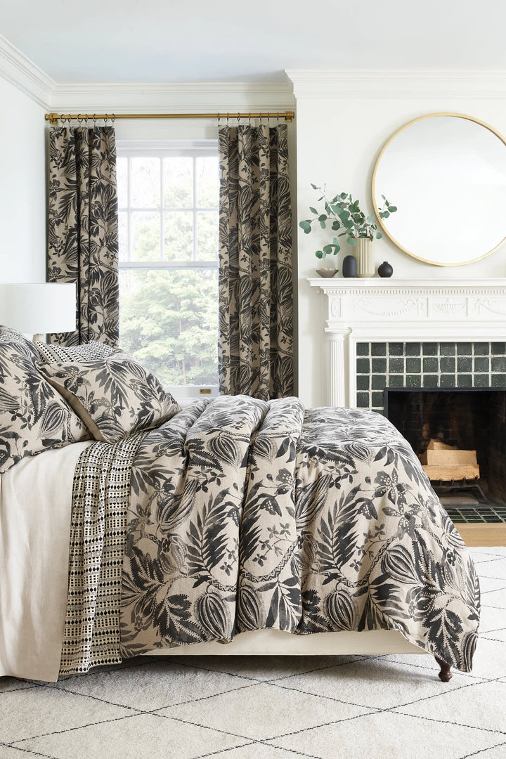 Make a bold bedroom statement with a large-scale botanical print that hints at lush fruits and foliage. This dramatic sham cover features inky black fronds, buds, and pods digitally printed onto rustic natural linen, then washed and tumbled to sublime perfection.