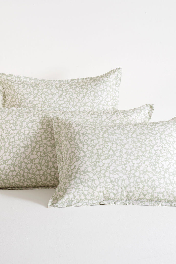 Our Aria Sage Sham is crafted from 100% crisp, cotton percale that’s perfect for all sleepers. With a soft sage-green background and a delicate, ivory floral motif, it adds a fresh, inviting touch to your bed. Ideal for any time of year, it’s a charming choice for any bedroom.