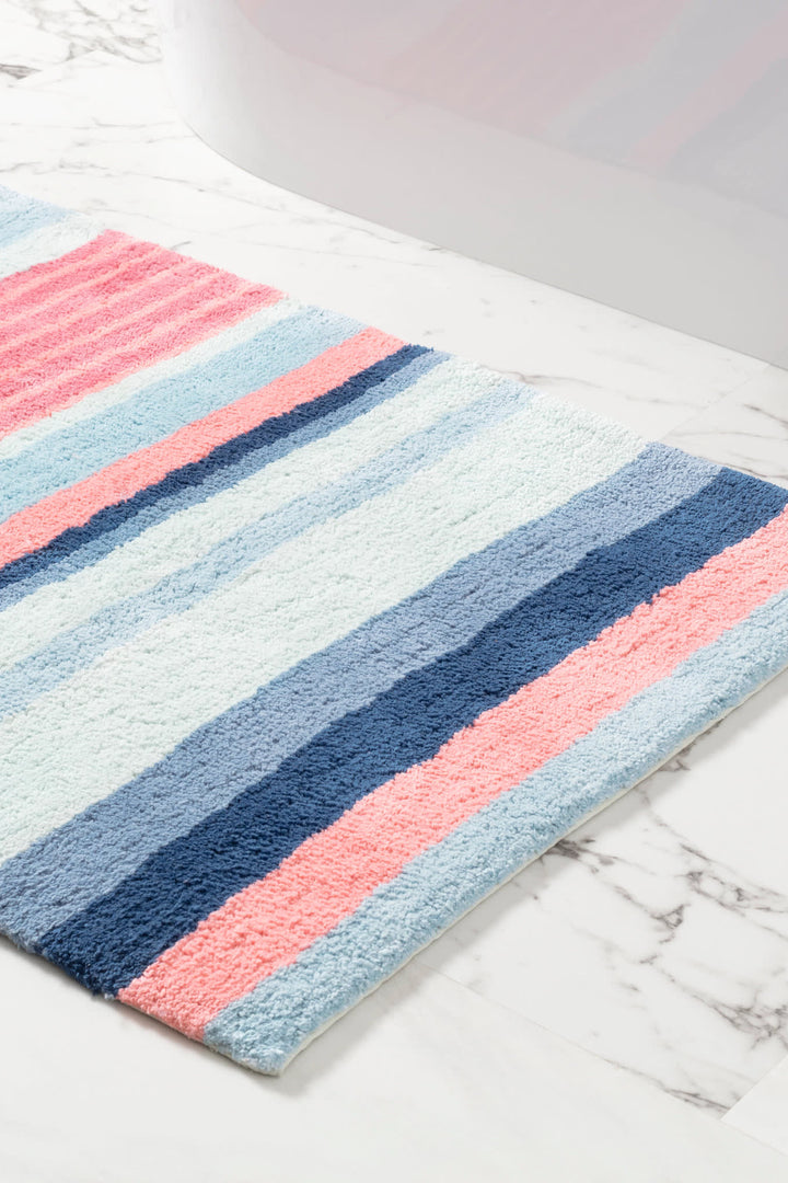 A better pick-me-up than that morning cup of joe: Step out of the shower and be greeted by one of our favorite stripes! Sun-drenched hues of Coral and Sky intersperse with variegated Coastal Blue deck stripes, inspired by our best selling Aruba flatwoven cotton rug. Densely tufted for cloud-like softness underfoot from a densely plush and substantial long-staple cotton.