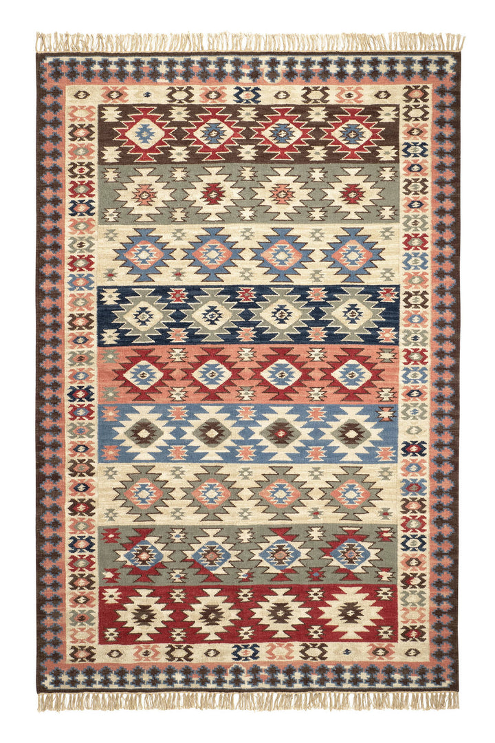 The Balsam Kilim Handwoven Wool Rug was inspired by a vintage kilim rug our designers discovered at the Brimfield Antique Market in Massachusetts. Made of wool and cotton, this eclectic piece will add character and warmth to any space with its flatwoven construction, geometric motifs, and hand-knotted fringe.