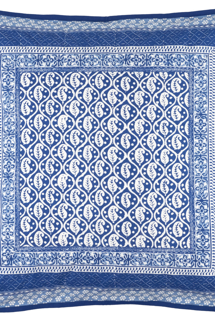 Bandana borders of indigo and ecru patterns reminiscent of resist-dyed South Asian textiles are expertly pieced together with mitred corners to form the concentric design of this matching coverlet and sham. Add beautiful and whimsical character, in crisp natural cotton, to your bed, layered with a variety of hues from natural to deep blue.