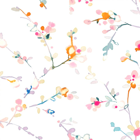 Pretty and painterly sprigs of tree blossoms rendered with a lovely, light watercolor quality fill a room with springtime. Add light and interest to any room with this lovely and traditional original print, a new addition to our wallpaper collection.