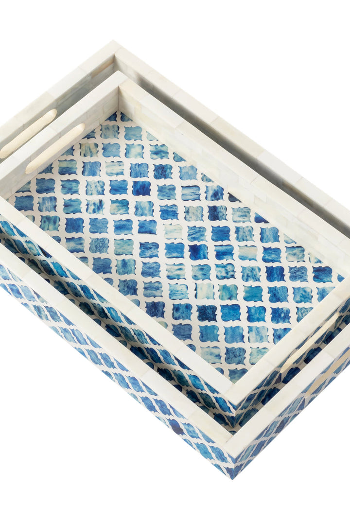 A gorgeous, subtle design is formed from an intricate ogee lattice pattern, masterfully inlaid by hand, using natural bone. This expertly made, simple tray is the perfect combination of exotic beauty and function, handcrafted by artisans. Available in two nesting sizes, the trays create the perfect organizing element for corralling toiletries and cosmetics, transporting cocktails or grounding a chic tabletop vignette.