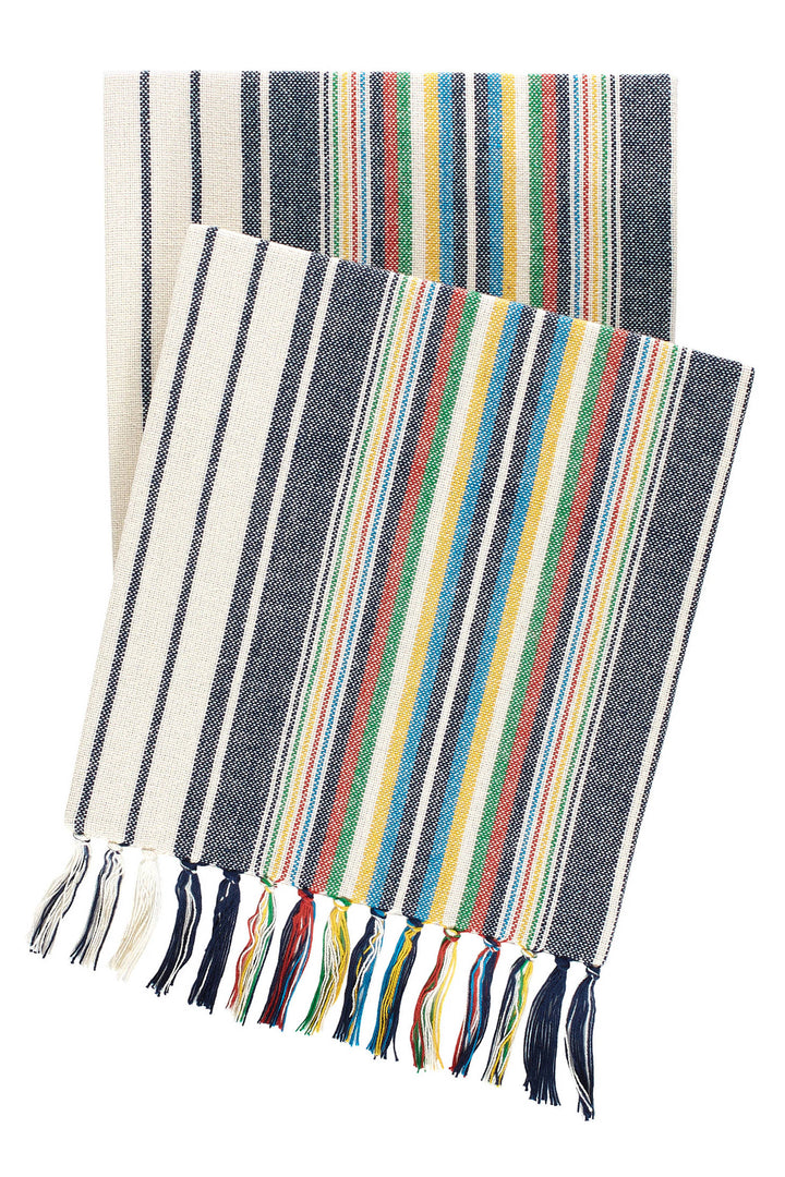 This homespun cotton weave throw features Indigo chambray Breton stripes on a creamy Ivory ground framed by a colorful variegated border and finished with a hand-knotted self-fringe. Great as an extra beach layer, tossed over the arm of a chaise or artfully folded on a stool or bench.