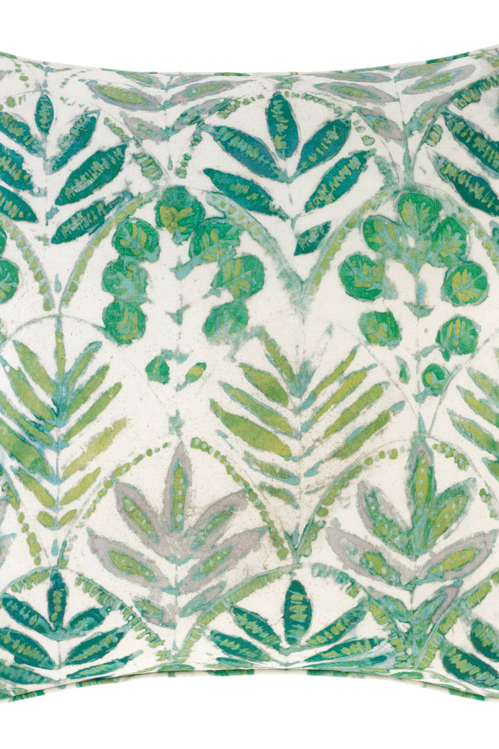 Into the woods with this forest inspired medley of verdant leaves, rendered in painterly watercolors and digitally printed for superior reproduction. Decorative pillow features Juniper, Sprout, Misty Green and Chartreuse fanning an ivory ground. The cotton and flax blend base cloth is specially developed for the softness and comfort of cotton with a dash of the textural hand of rustic linen. Double sided print with piped seams. Available as a square and a rectangular pillow.