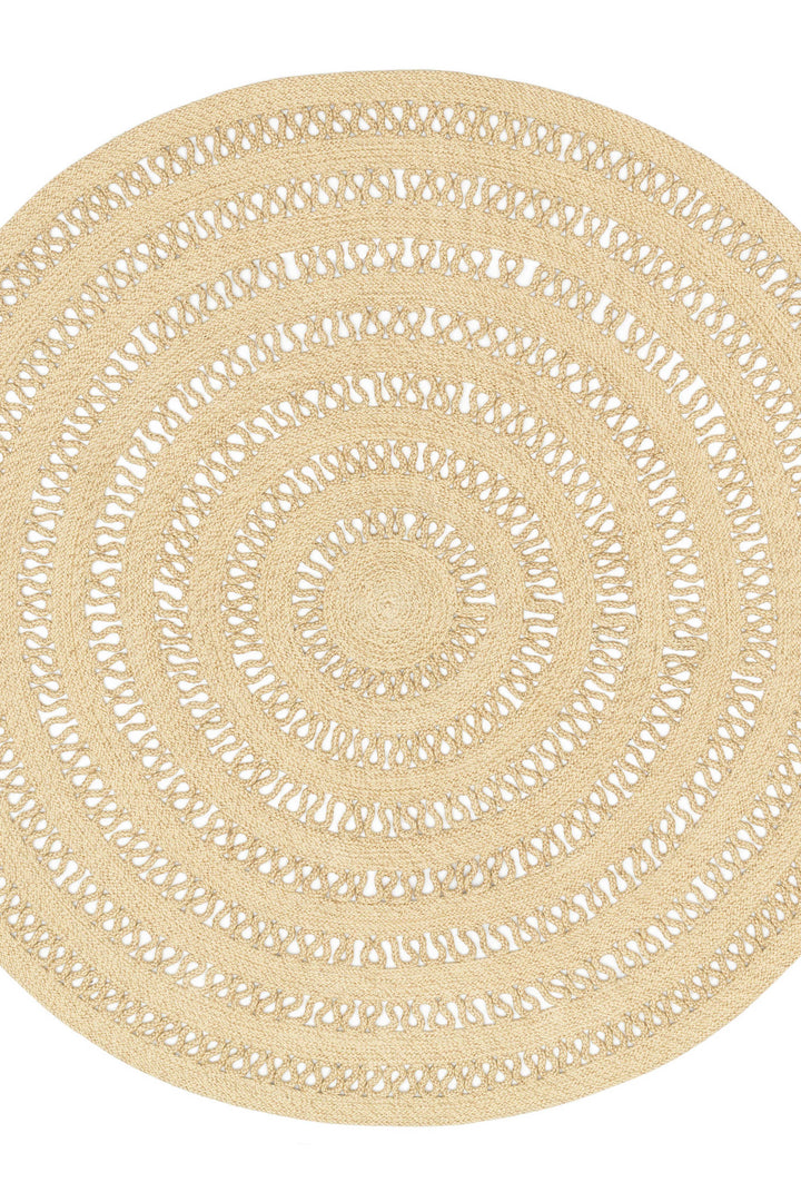 Stunning filigree mandala rug is hand-crafted in subtle, organic patterns, created by twisting and binding performance fiber rope to itself. Pliable and soft, this washable floor covering elevates and cushions without obscuring, allowing for the beauty of natural hardwood boards, or the colorful trend of a painted floor, to shine through. With a latex backing to stop the slip, this hard-working rug will stand up to the test of time with its easy care, and family and pet-friendly qualities.