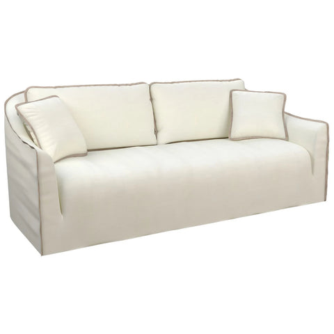 Take it easy and relax in style: Deep plump cushions and slim but curvaceous back and arms add an air of Art Deco glamour to this pared back, modern, slipcovered sofa. An ivory sofa provides a foundation for endless options of decorative pillows and its casually clean lines and easy-cleanup slipcover bring a relaxed breath of freshness to family rooms and sunrooms. <br><br> Includes two 20" x 20" throw pillows.