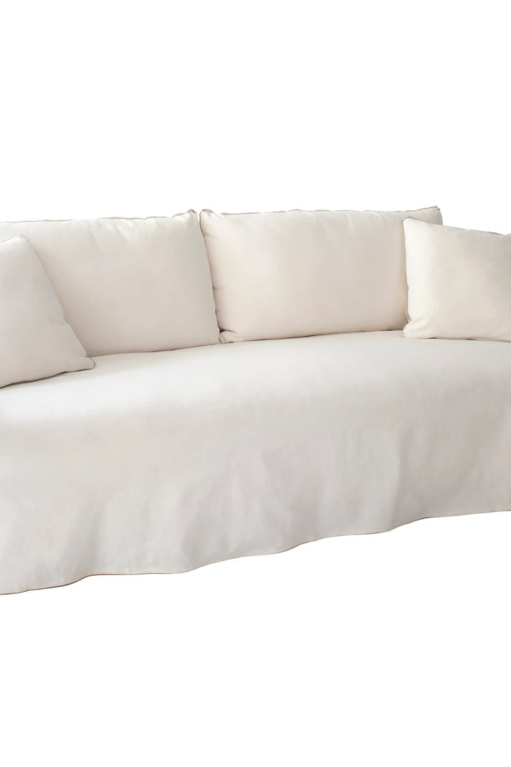 Take it easy and relax in style: Deep plump cushions and slim but curvaceous back and arms add an air of Art Deco glamour to this pared back, modern, slipcovered sofa. An ivory sofa provides a foundation for endless options of decorative pillows and its casually clean lines and easy-cleanup slipcover bring a relaxed breath of freshness to family rooms and sunrooms. <br><br> Includes two 20" x 20" throw pillows.