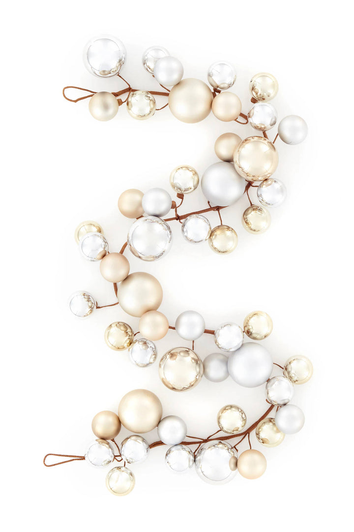 Showcase your personal style through your home's holiday decor. This simple string of spheres in matte and shiny silver and pale gold will add a minimal luxurious shimmer to catch the light. Its seasonless appeal can be utilized to enliven your indoor or exterior spaces any time you need to show a little levity.