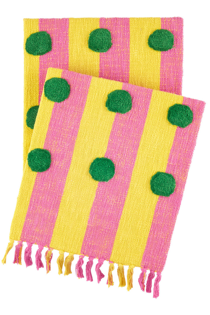 Add a jolt of vibrant color to your home with this homespun cotton throw. Boldly striped in yellow and pink slubbed yarn and accented with green velvety dots of sheared French-Knot embroidery. A hand-braided tasseled self-fringe finishes the look. Part of the Frances Valentine x Annie Selke Collection.