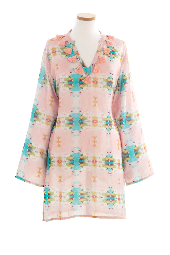 Our simple straight cut tunic is inspired by the Indian kurta, an eminently practical garment evolved over millennia for gracefully navigating the summer heat. What better prints to offer it in then, but our collection of fresh and bright kaleidoscopic repeats developed from the original art of Laura Park. Easy to wear and eminently comfortable in cotton voile, and trimmed with transfixing tassels at neck and placket.