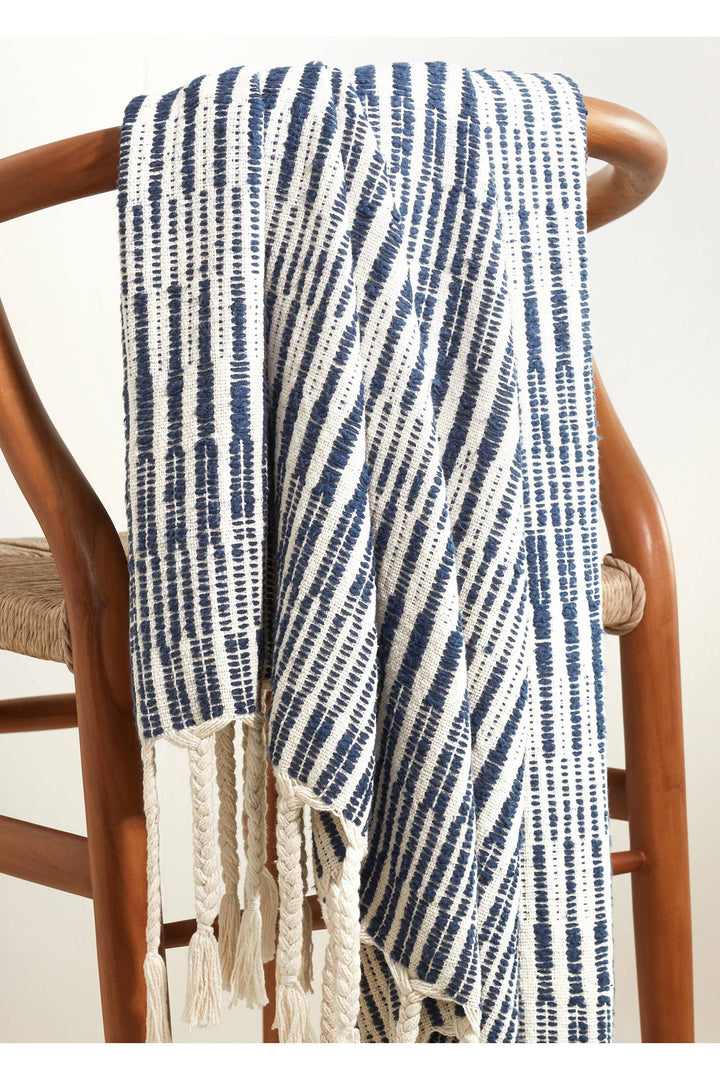 Tribal stripes of slubby navy are satin stitched in bands on a white handwoven cotton blanket for a soft beachy take on ethnic patterning. A beautiful braided fringe adds to the Moroccan context.
