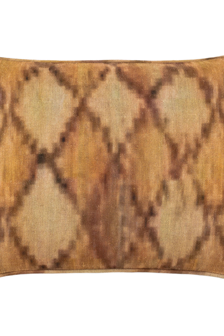 The poetry of the loom is captured in this beautiful print on natural linen, evoking the blurring lattice design of traditional Ikat weaving in shades of dusty Nutmeg, Gold, Natural and Ivory. Double sided print with piped seams.