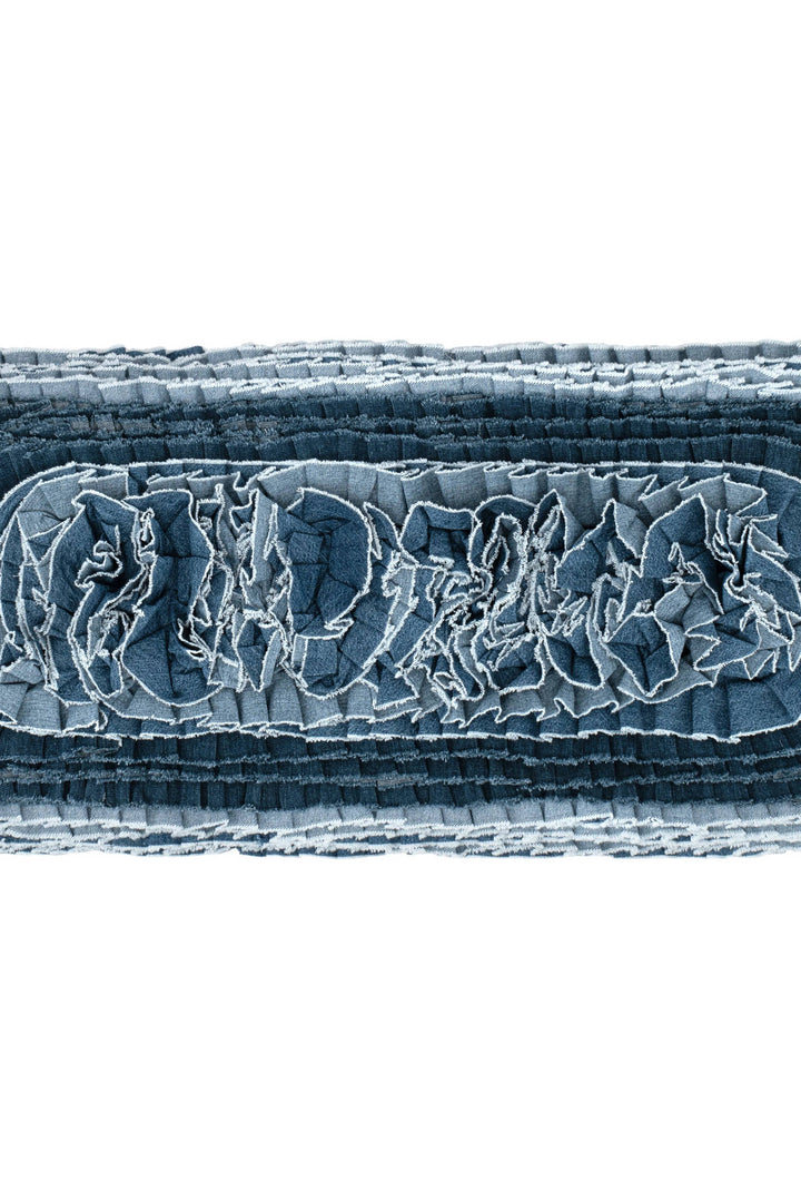 Crafted with meticulous hand-stitching, this lumbar-size pillow features multiple layers of ruffles made from recycled cotton denim. Inspired by a unique denim rug found at the renowned Brimfield Antique Market in Massachusetts, it boasts a woven fringe and a ton of vintage charm. Due to its handcrafted nature, no two are alike.