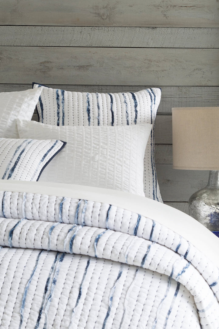 Inspired by traditional Indian kantha quilts, this silky-soft cotton voile quilt features textured, speckled indigo stripes, contrast kantha stitching, and indigo banding on a plush white backdrop. Mix and match with other shades of blue, or let this quilt pop against juicy brights like persimmon, citrus, and fuchsia.<br><br> • 100% cotton voile; 100% cotton batting.<br> • Kantha stitched.<br> • Solid indigo band/hem on all sides.