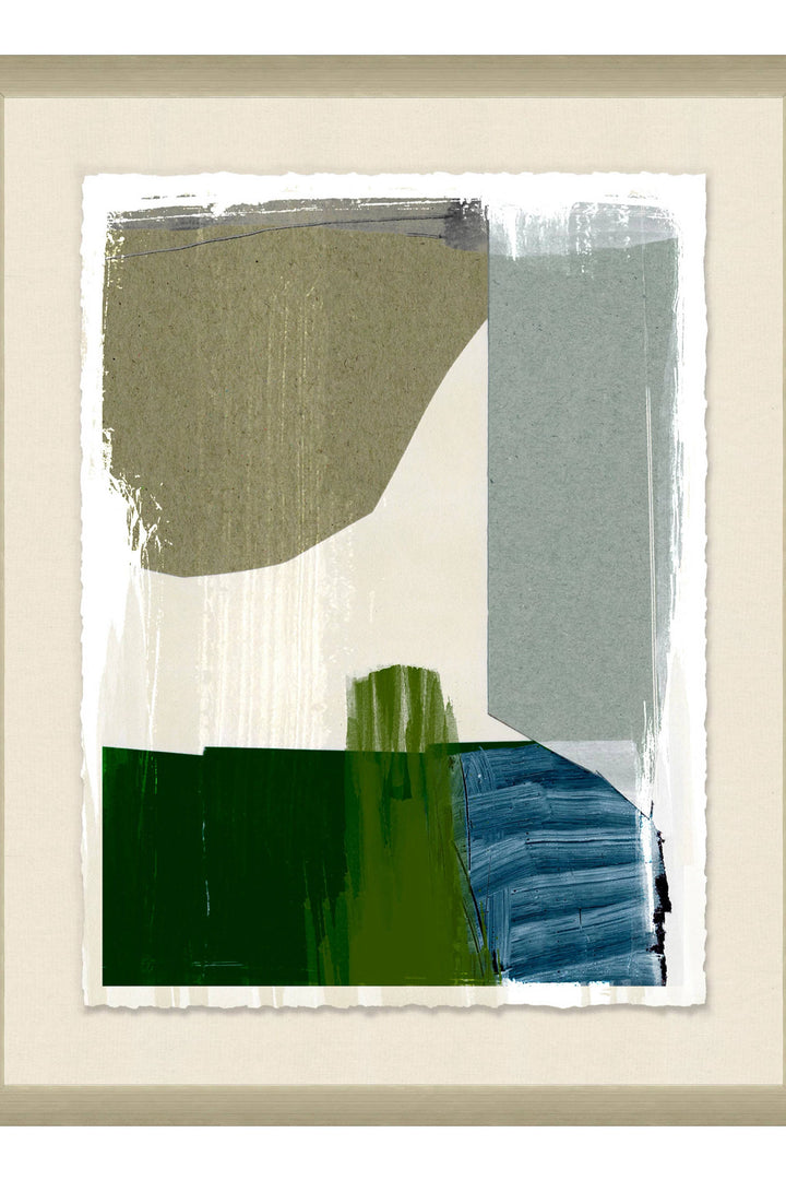 Handcrafted giclee on paper, this abstract artwork is floated on a hand-wrapped raw canvas mat with a muted silver frame. Comes ready to hand with single-wire hardware.
