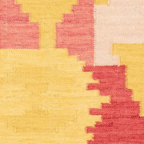 Colors glow golden, like spring sunshine, uniting the vividly pixilated floral patterns to create a wholly unique design for a joyful, comfortable, welcoming environment. Nature inspired forms in Gold, Scarlet, Coral, Sprout and Sky interlock emphasizing the flatwoven, handmade nature of this flatwoven wool kilim rug. From the studio of Kit Kemp, a poet of color, whose distinctive style is defined by a reverence for artisans and a disdain for the rules, and the lines between art and life become indistinguishable and blurred.