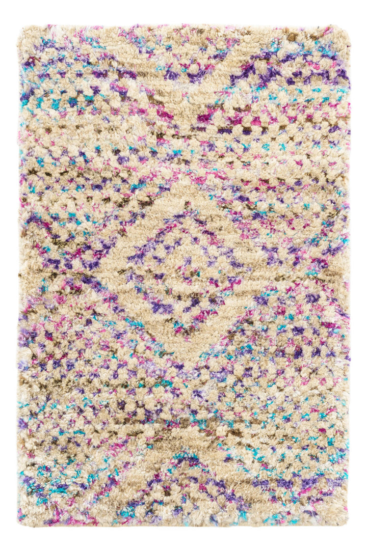 Recycled silk and viscose saris are repurposed to stunning effect in this hand-knotted jute rug. With its shimmery sheen and rainbow-hued diamond design, it boasts an opalescent appearance that will add visual interest and rich texture to any space.