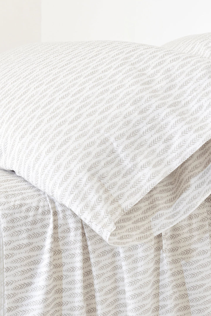 A playful twist on classic percale. Inspired by classic block printing, the crisp white background and repeating feather pattern add a subtle yet stylish flair to your bed.