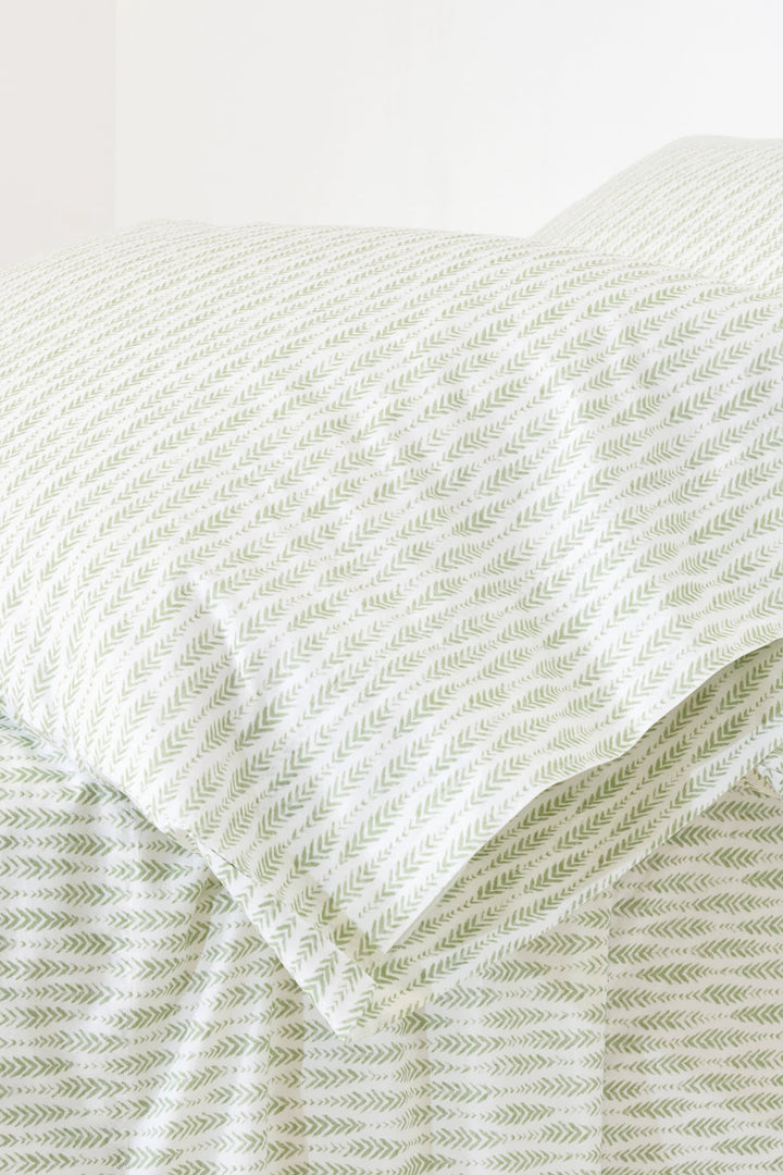 A playful twist on classic percale. Inspired by classic block printing, the crisp white background and repeating feather pattern add a subtle yet stylish flair to your bed.