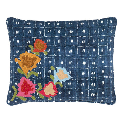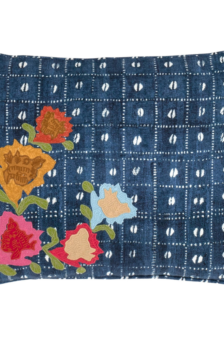 This one-of-a-kind pillow features hand-embroidered florals inspired by a vintage textile our designers discovered at the famed Brimfield Antique Market in Massachusetts. The graphic, block print base pairs perfectly with our Kodi Batik Indigo Duvet Cover and Shams for a stylish, eclectic look.