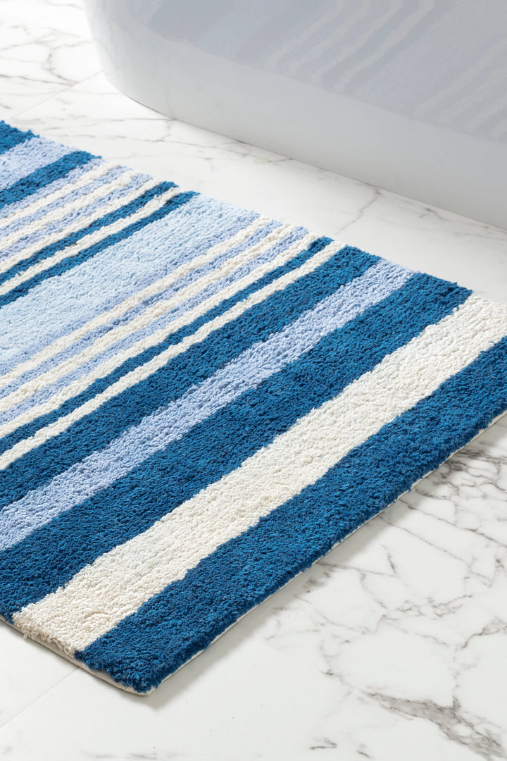 Have you got that happy feeling? Dance into your day with our luxe and lively bath rugs. Step out of the shower and hit refresh with atmospheric, variegated stripes in coastal hues. Bold, spa-like plushness underfoot. Tufted for cloud-like, thick, thirsty softness from a densely cushy and substantial long-staple cotton.
