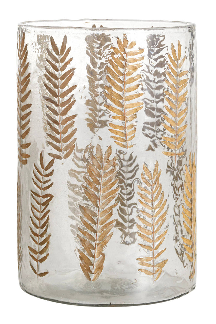Intricate lacy forms of gilded fronds lend an elegant edge to this beautifully proportioned glass vessel. Bring a light touch to your seasonal decorating with an arrangement of evergreens, or place a pillar candle within to project a dazzling ambiance.