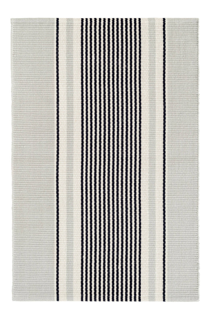 A sophisticated awning striped rug in classic colors of midnight, grey and white has an urban coastal vibe. This new addition to our cotton flatweave rug collection is a perfect pairing for any bed dressed in our Signature Bedding collection. Soft underfoot, reversible and easy on your pocket, our bestselling flatweave cotton rugs are renowned for their versatility, affordability, and durable construction.
