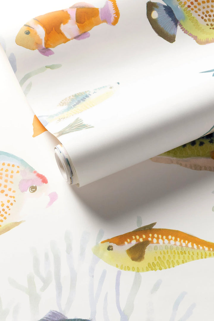 Turn your favorite space into a dreamy aquarium. Perfectly reproduced watercolor rendering of colorful fish among coral spires is printed on high-quality eco-friendly paper for superior reproduction and easy care. With a smooth matte finish and scratch resistance, this charming design creates a stunning accent wall in bedrooms, bathrooms and beyond. Our fresh new twist on wall treatments features a whimsical print in zingy colors on a bright white ground.