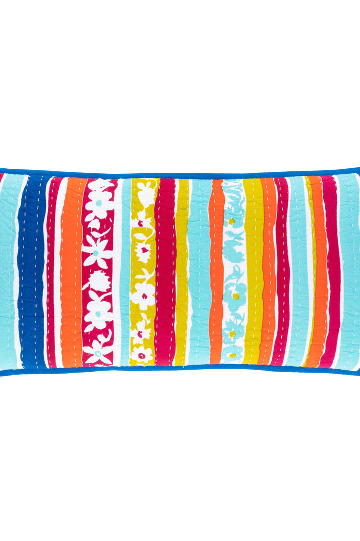 Dazzlingly cheerful, lightly quilted cotton decorative pillow is inspired by the tropical garden at Rossferry, Kit Kemp's Caribbean hideaway in Barbados. Hand painted stripes of bold and lively hues sing together in carefree abandon. Daisy chains add whimsical flourishes, inspiring a light hearted mood. Reverses to a bold geometric print and held together with hand worked Kantha stitching. One of the modern creations from the design collaboration between Annie and Kit Kemp, co-owner and Creative Director for Firmdale Hotels, united by their passion for colorful and carefree design, redefining contemporary Arts and Crafts for everyday life.